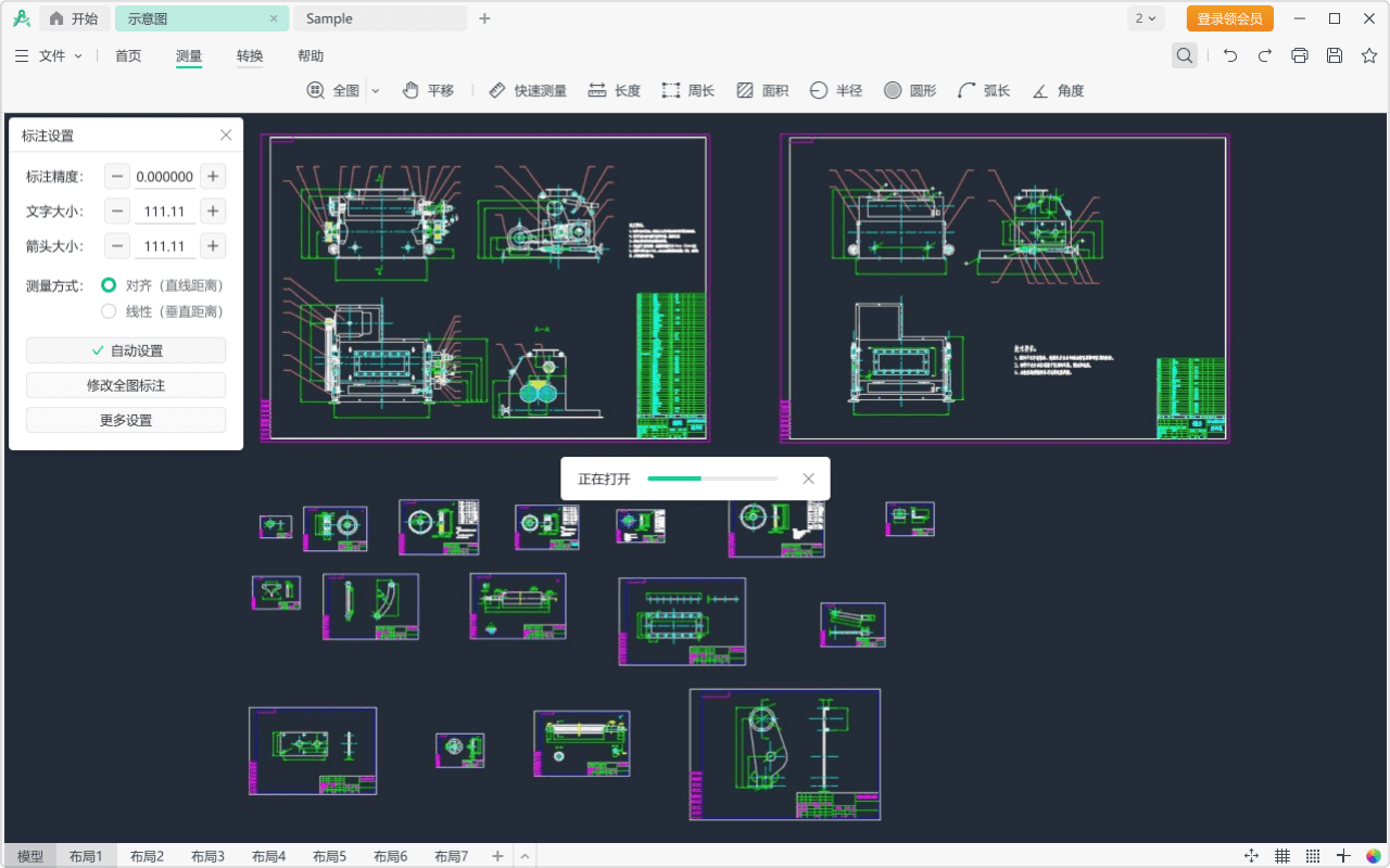 画直线辅助测量。直线可被测量,和原图纸线条相交产生交点,也可捕捉